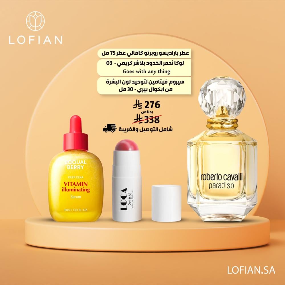 بكج عرض, عطر باراديسو روبرتو كافالي عطر 75 مل + لوكا أحمر الخدود بلاشر كريمي - 03 + سيروم فيتامين لتوحيد لون البشرة من ايكوال بيري - 30 مل شامل التوصيل والضريبة