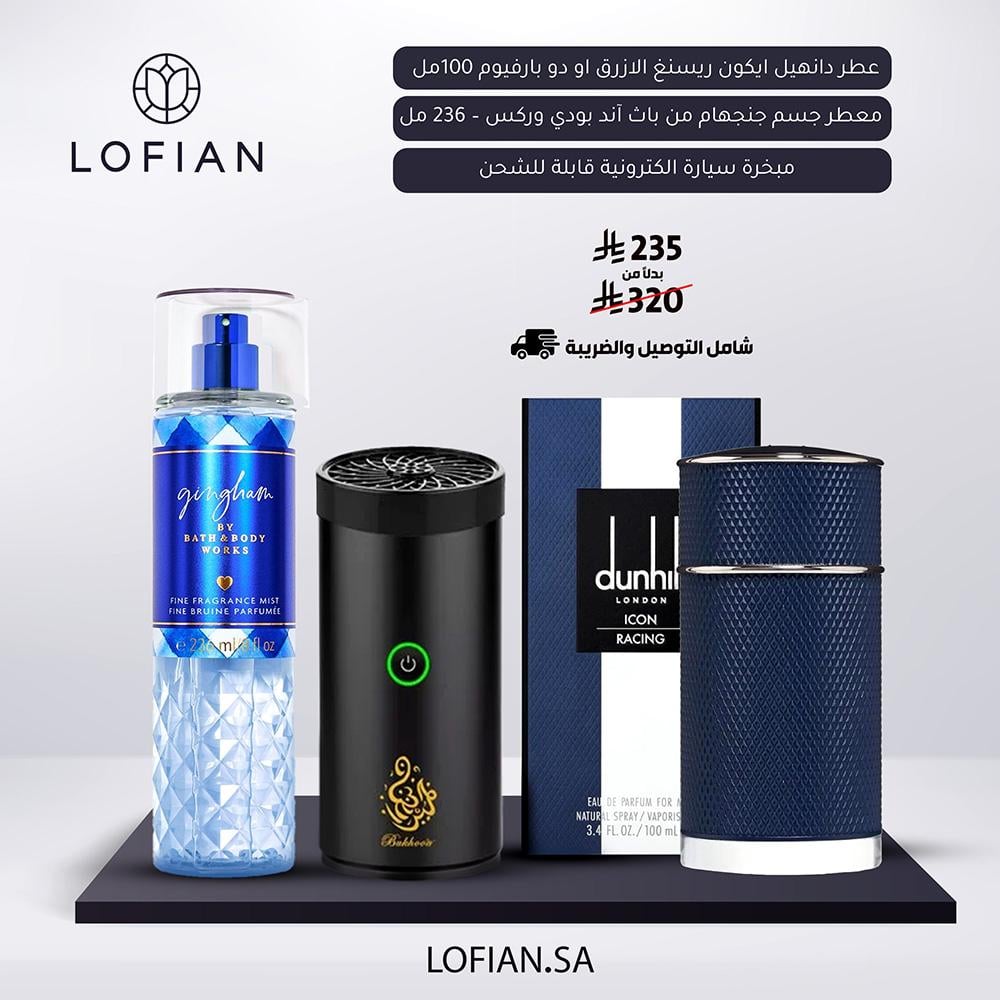 عطر دانهيل ايكون ريسنغ الازرق او دو بارفيوم 100مل + معطر جسم جنجهام من باث آند بودي وركس – 236 مل + مبخرة سيارة الكترونية قابلة للشحن